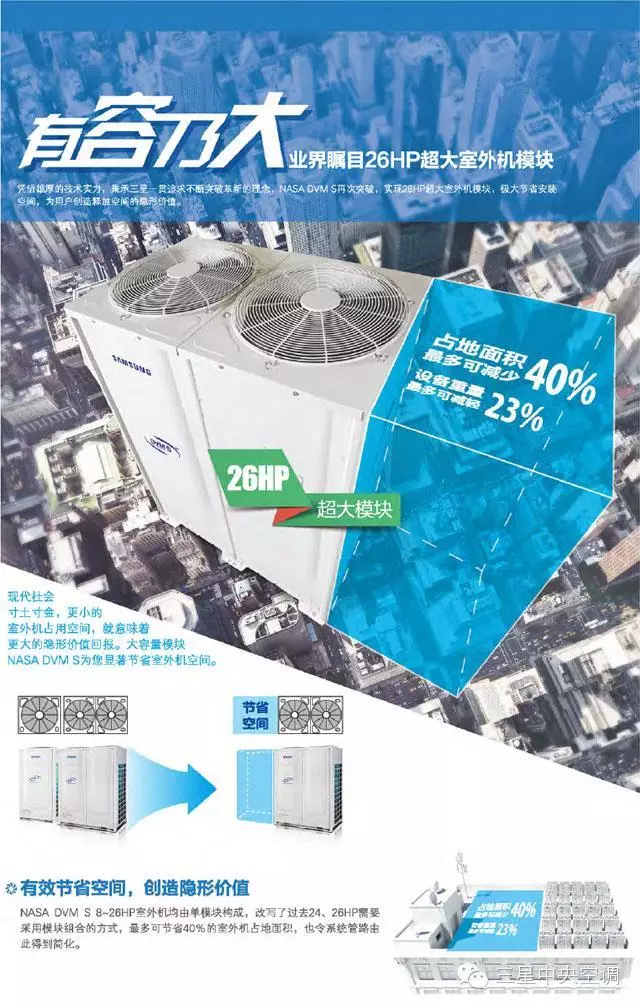 更大型模塊 身材雖小 用途無限:NASA DVM S 空調系統擁有著業界**的單模塊容量——**大可達26HP,極大節省安裝空間。NASA DVM S 8~26HP室外機均由單模塊構成,改寫了過去24HP、26HP需要采用模塊組合的方式,**多可節省40%的室外機占地面積,設備重量**多可減輕23%。在現如今這個寸土寸金的時代里,更小的室外機占用空間,就意味著更大的隱形價值回報。并且,小巧的空調室外機,更能靈活地應對各種規模建筑的設計與造型需求等。
